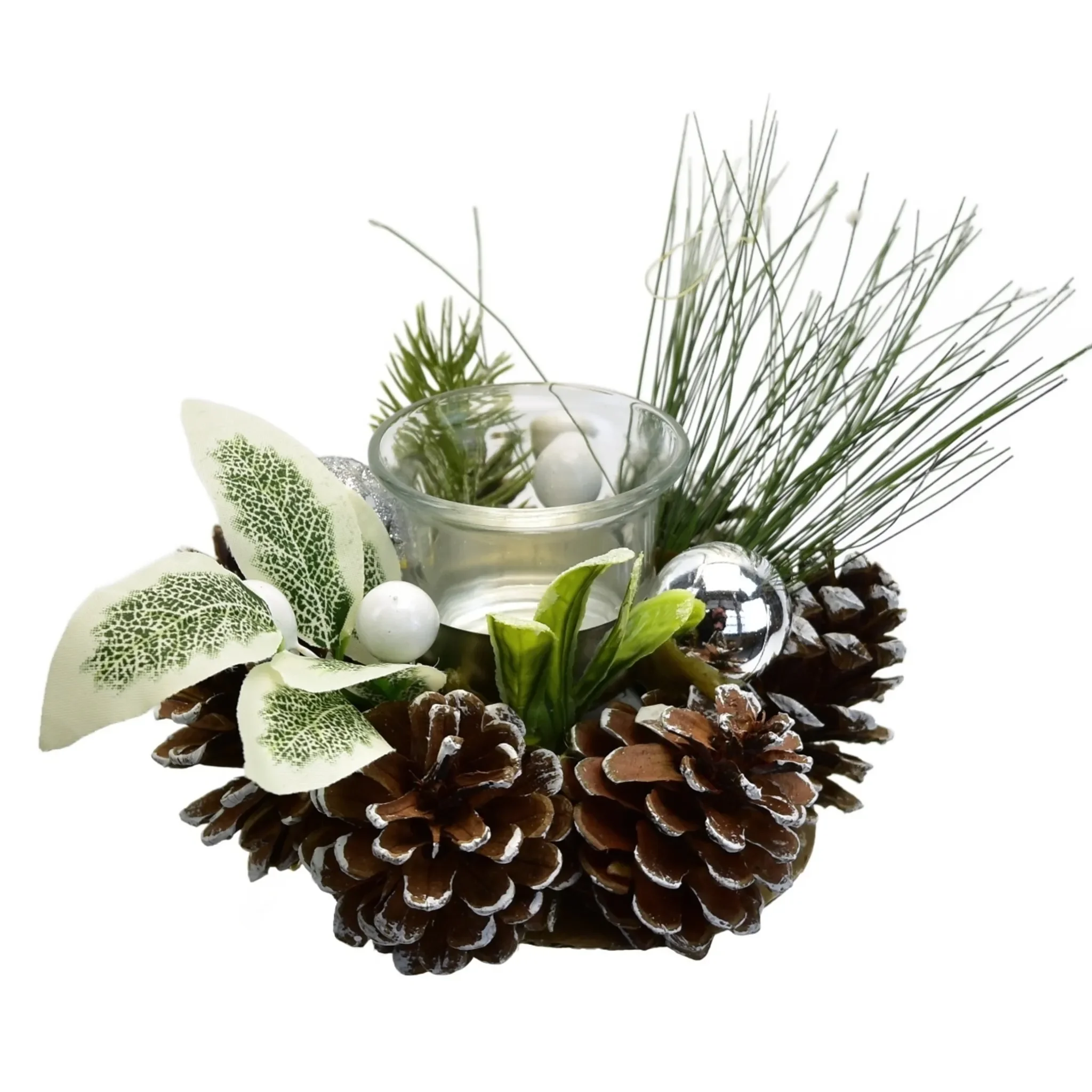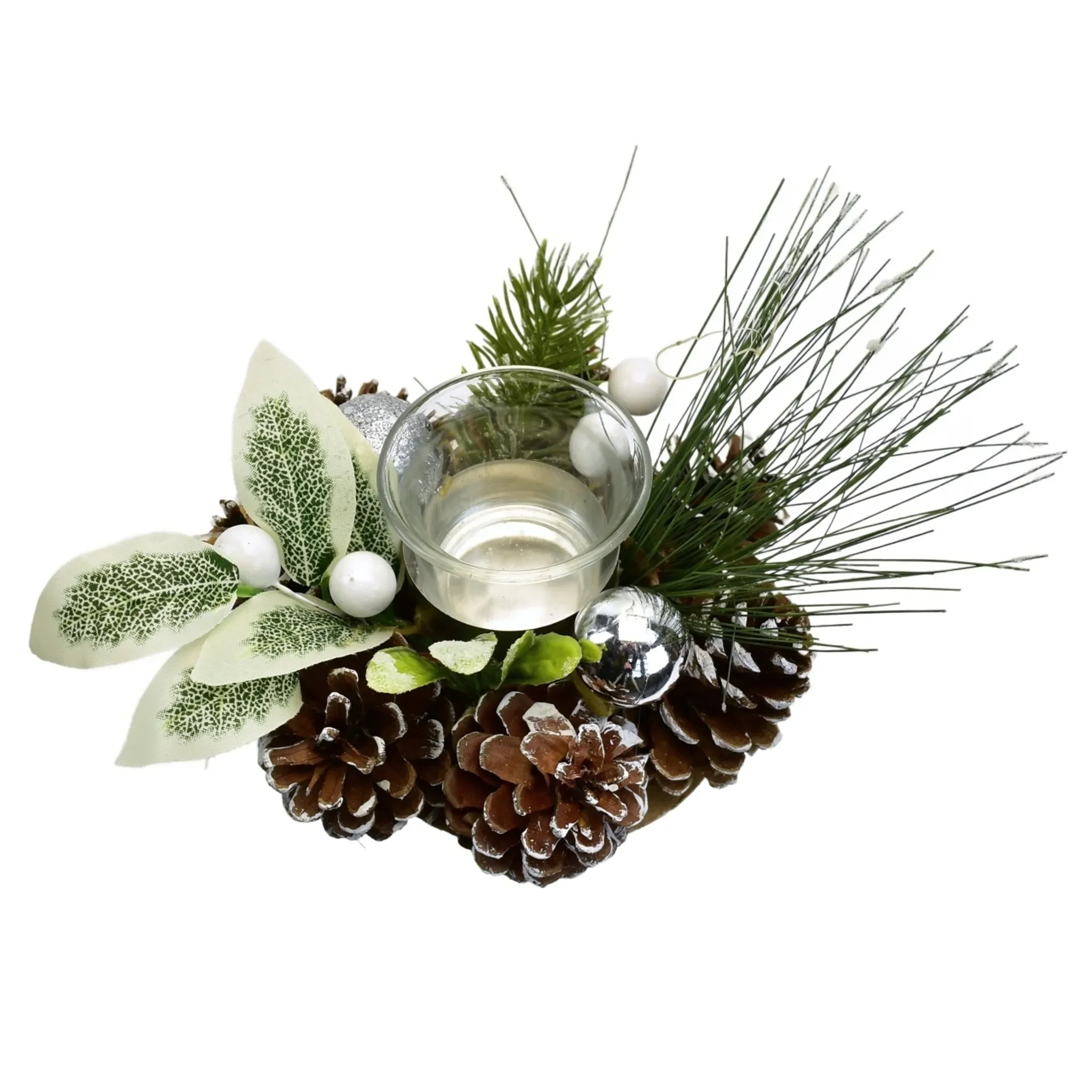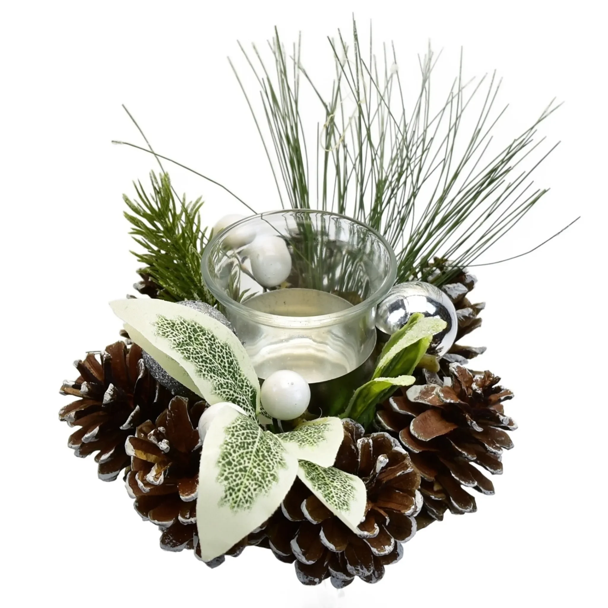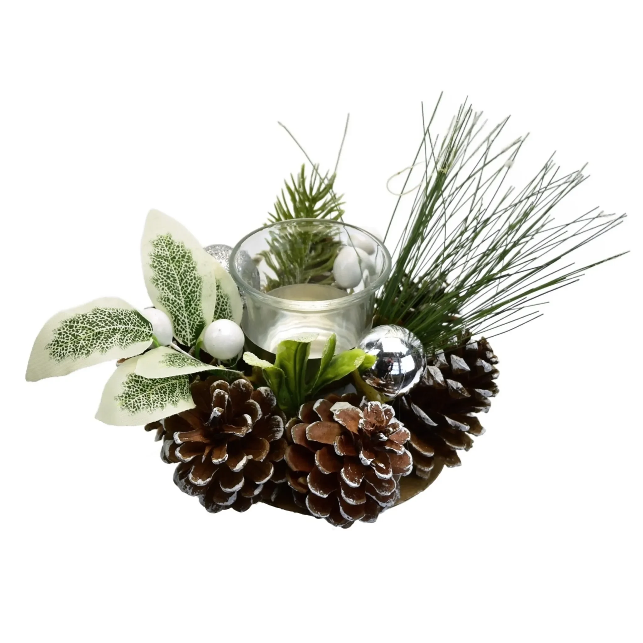 Highlights: Winterlich dekoriert, integriertes Glas für Teelicht, natürliche Gestaltung, vielseitig kombinierbar, ideal für festliche Wohnakzente.