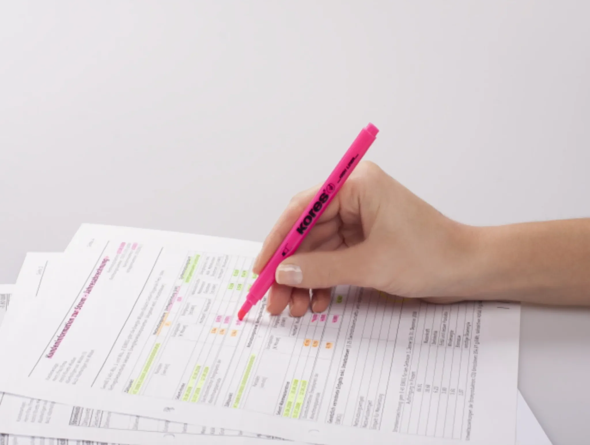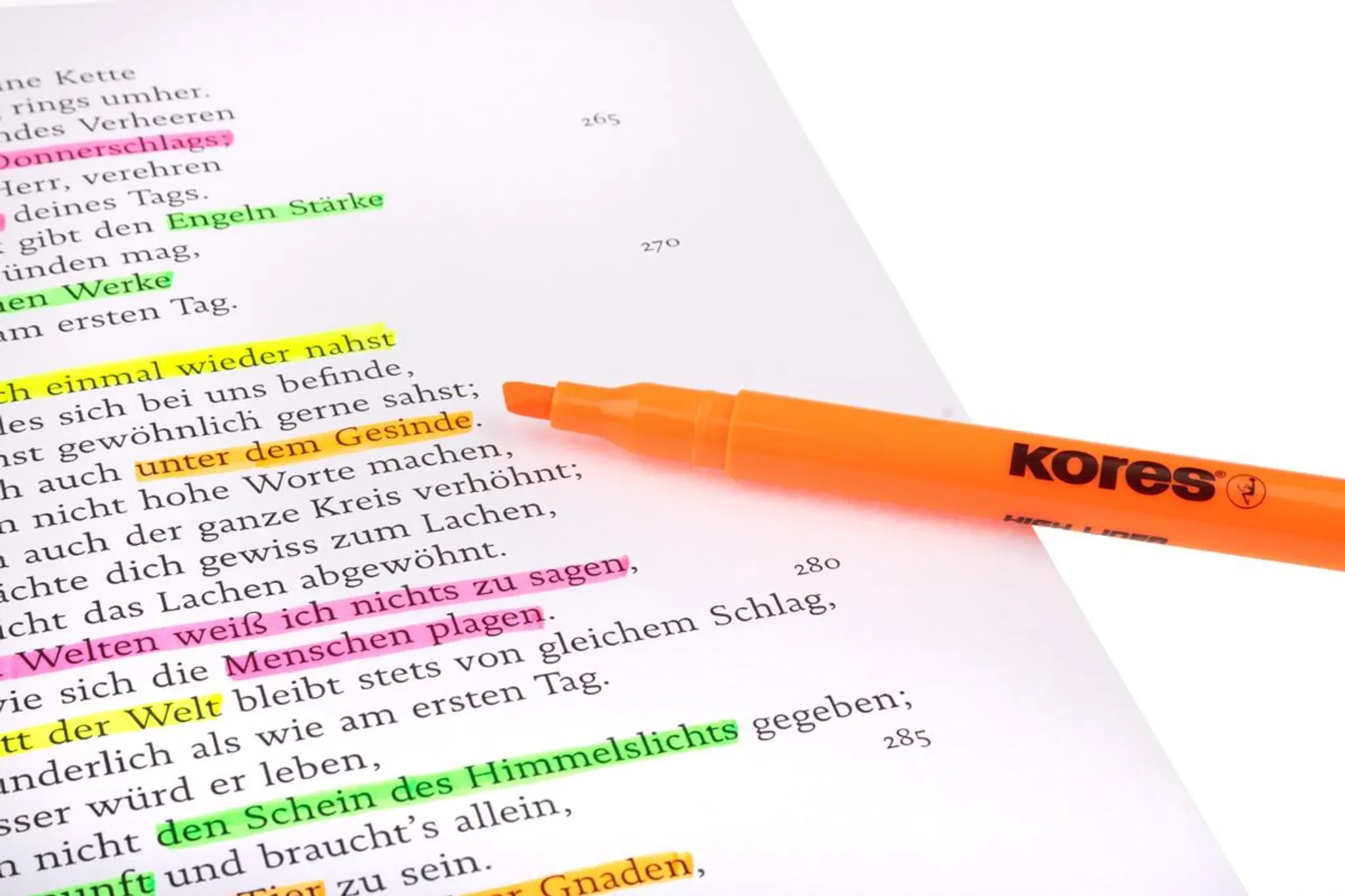 Die kompakten High-Liner-Textmarker von Kores kombinieren schlanke Stiftform mit brillanten, fluoreszierenden Farben. Dank Keilspitze lassen sich sowohl breite Markierungen als auch feine Linien präzise setzen – ideal für Schule, Studium, Büro oder Unterwegs.