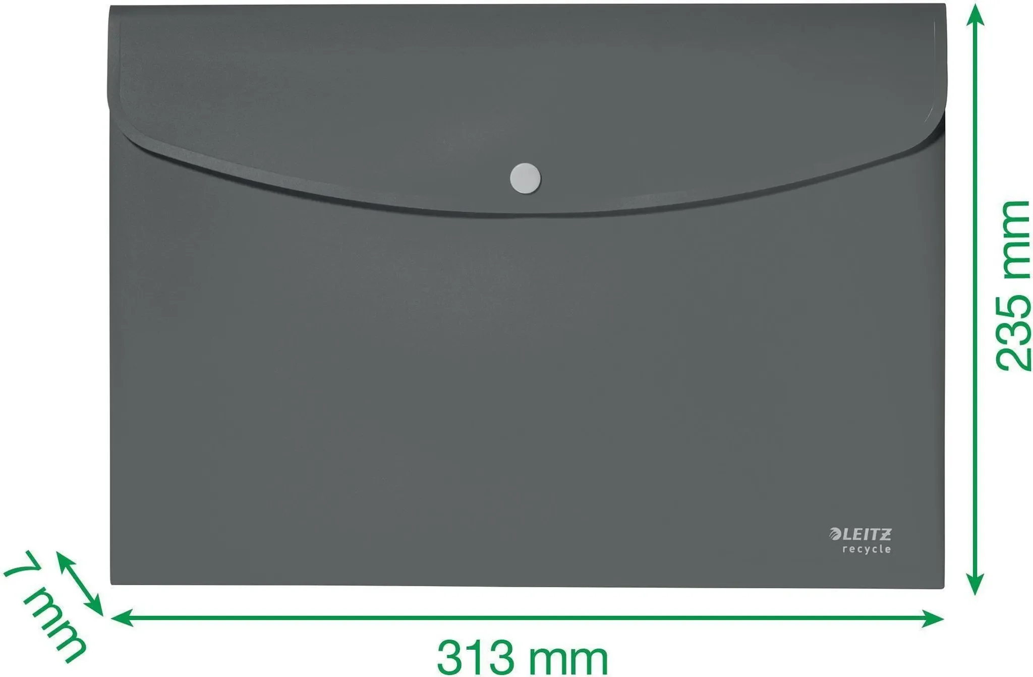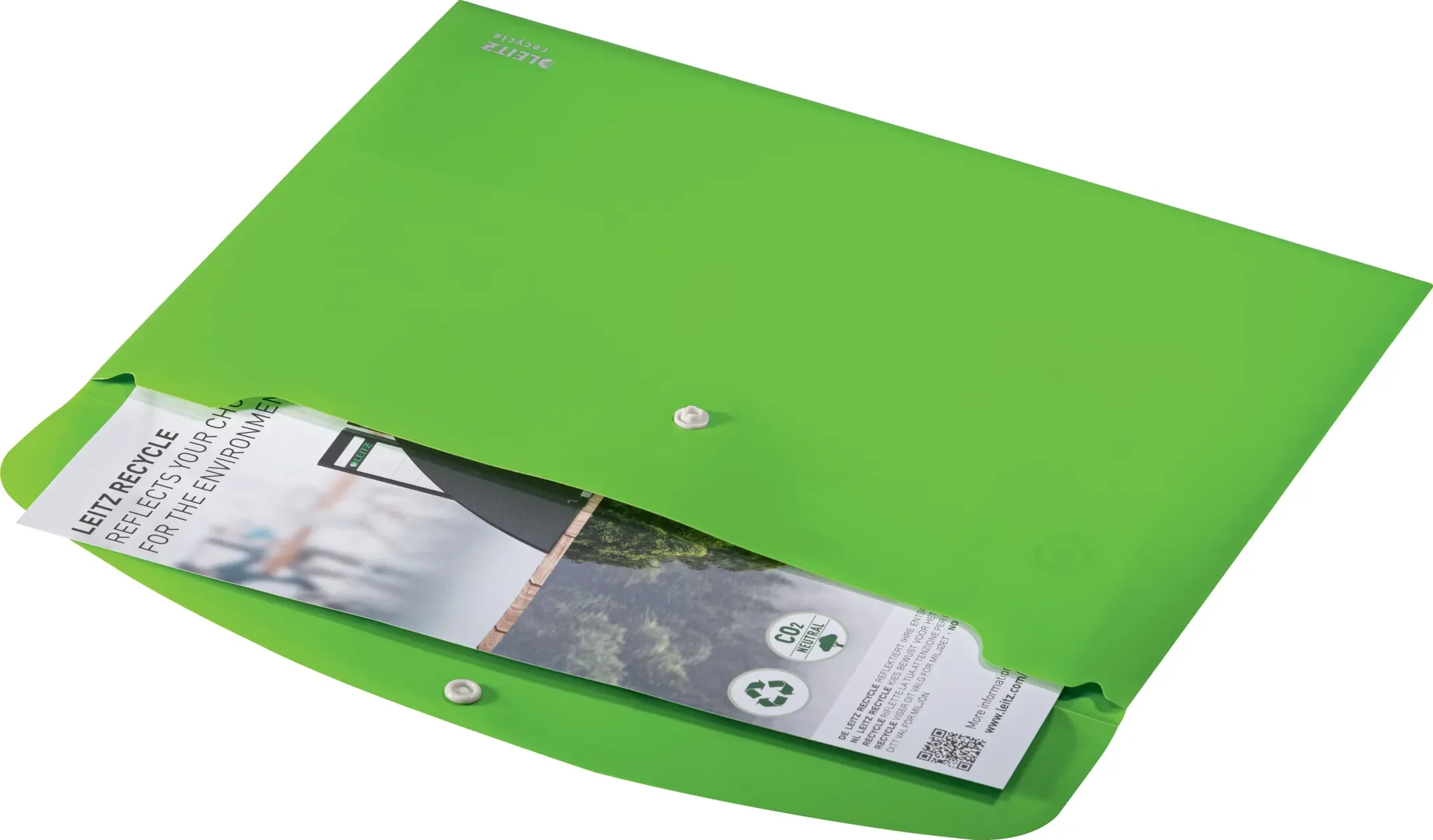 Die nachhaltige Dokumententasche aus der Leitz-Recycle-Serie überzeugt mit blickdichtem Material und einem praktischen Druckknopfverschluss. Aus 80 % recyceltem Post-Consumer-Kunststoff gefertigt und zu 100 % recycelbar, eignet sich die Tasche ideal für Schule, Büro und Home-Office.